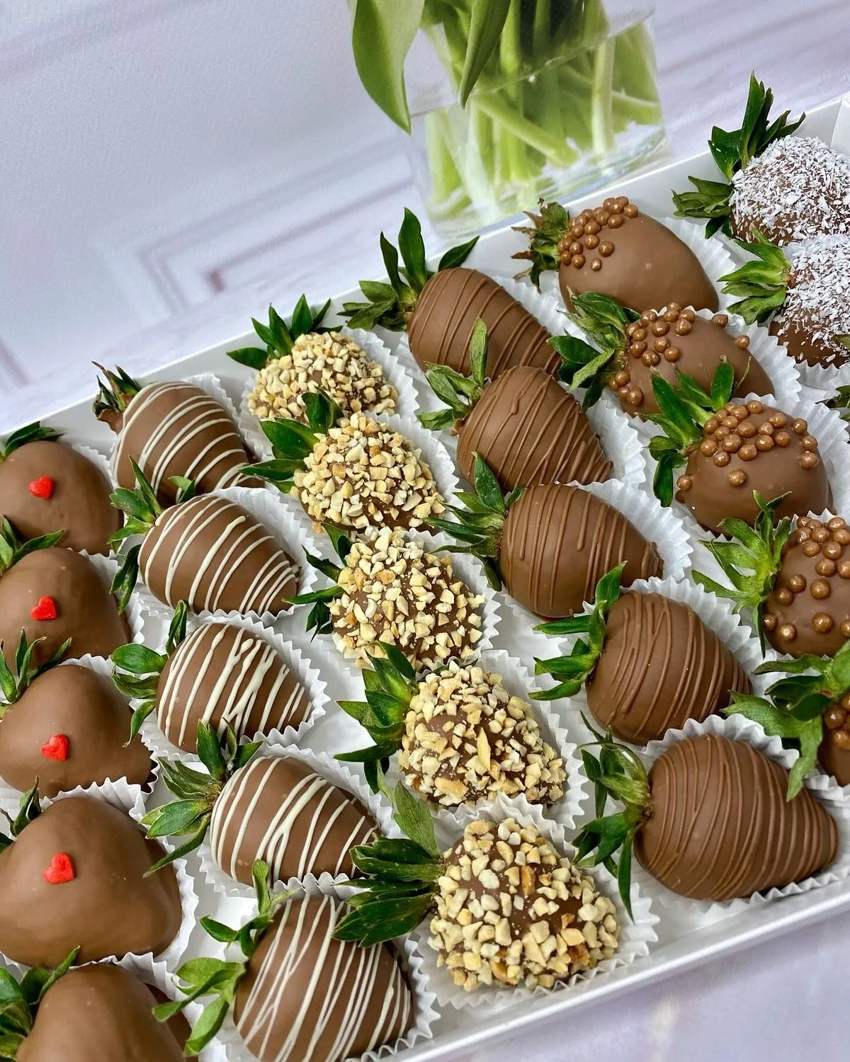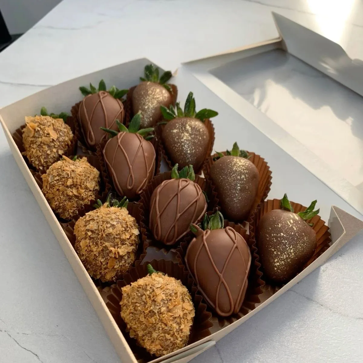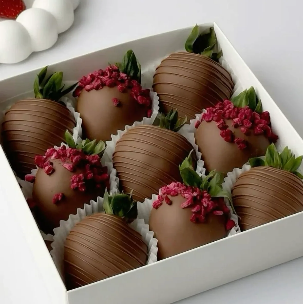 Состав и текстура: Целая ягода с зелёной чашелистиками (их оставляют для удобства и контраста) наполовину или полностью погружается в растопленный шоколад. После застывания образуется тонкая хрустящая оболочка, которая при надкусывании даёт приятный треск, а затем раскрывается сочная, нежная мякоть клубники. Игра температур (прохладный шоколад и комнатная или чуть тёплая ягода) делает вкус особенно ярким. Виды шоколада: · Тёмный (от 50% какао) — классика: оттеняет сладость ягоды, добавляет глубину и пикантную горчинку. · Молочный — мягкий, карамельно-сливочный, нравится детям и тем, кто избегает горечи. · Белый — очень сладкий, с нотками ванили и сухого молока; часто сочетают с клубникой для "десертного контраста". · Рубиновый (нетрадиционный розовый шоколад с природным ягодным вкусом) — усиливает клубничный аромат.